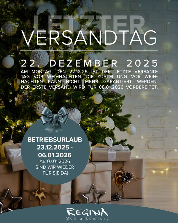 wie jedes Jahr stehen wir für "Last-Minute-Einkäufe" ihrer Kunden bereit. Bestellen Sie bei uns Matratzen und Bettwaren in Standard- und diversen Sondergrößen** damit diese noch vor Weihnachten produziert und versendet werden. Am Montag, den 22.12.25 ist der letzte Versandtag vor Weihnachten.